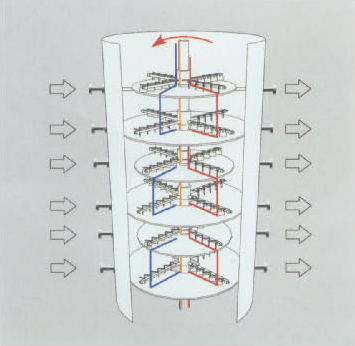 ◆ 物料沿指数螺旋线流经赶走盘表面,在小干燥盘上的物料通过耙叶的翻抄被移动到外缘,并在外缘落在正下方的大干燥盘外缘,在大干燥盘上的物料向里移动并从中间落料口落入下一层小干燥盘中。大、小干燥盘交替排列,被干燥物料得以连续流经整个干燥有效区。物料受热均匀,无返混,无死角,终水分稳定、一致。确保成品质量。盘式干燥机中的关键部件耙叶、干燥圆盘,采用多道特殊的压制、成型工艺,确保干燥效果和设备的正常运行。对于有些地区一年四季气温变化及空气相对湿度高等特点,成品物料水分接近无水的要求,在盘式干燥的基础上,辅以空气加热干燥并及时排湿的措施,避免了蒸发湿份冷凝回流,确保终水分一次性达到要求。