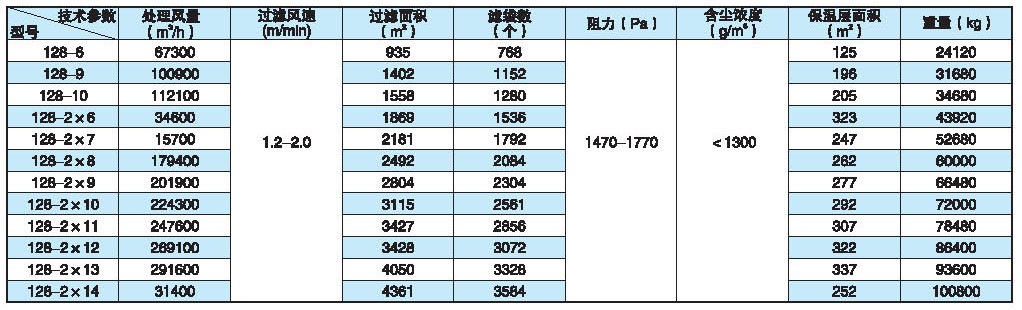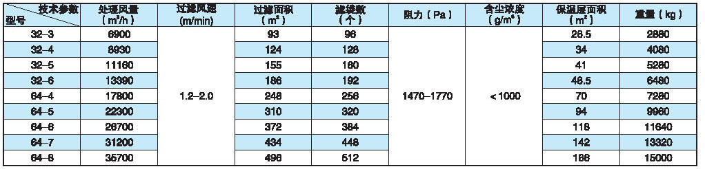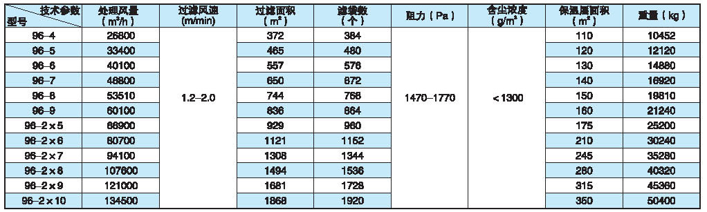 ◆ 本系列产品共有33种规格,每室的袋有32、64、96、128袋四种,滤袋长度有2450mm和3060mm两种,收尘效率可达99.9%以上。净化后气体的含尘尝试小于100mg/m3(标)本系列收尘器如用于寒冷地区,当室外采暖计算温度≤-25℃时。要设热装置。